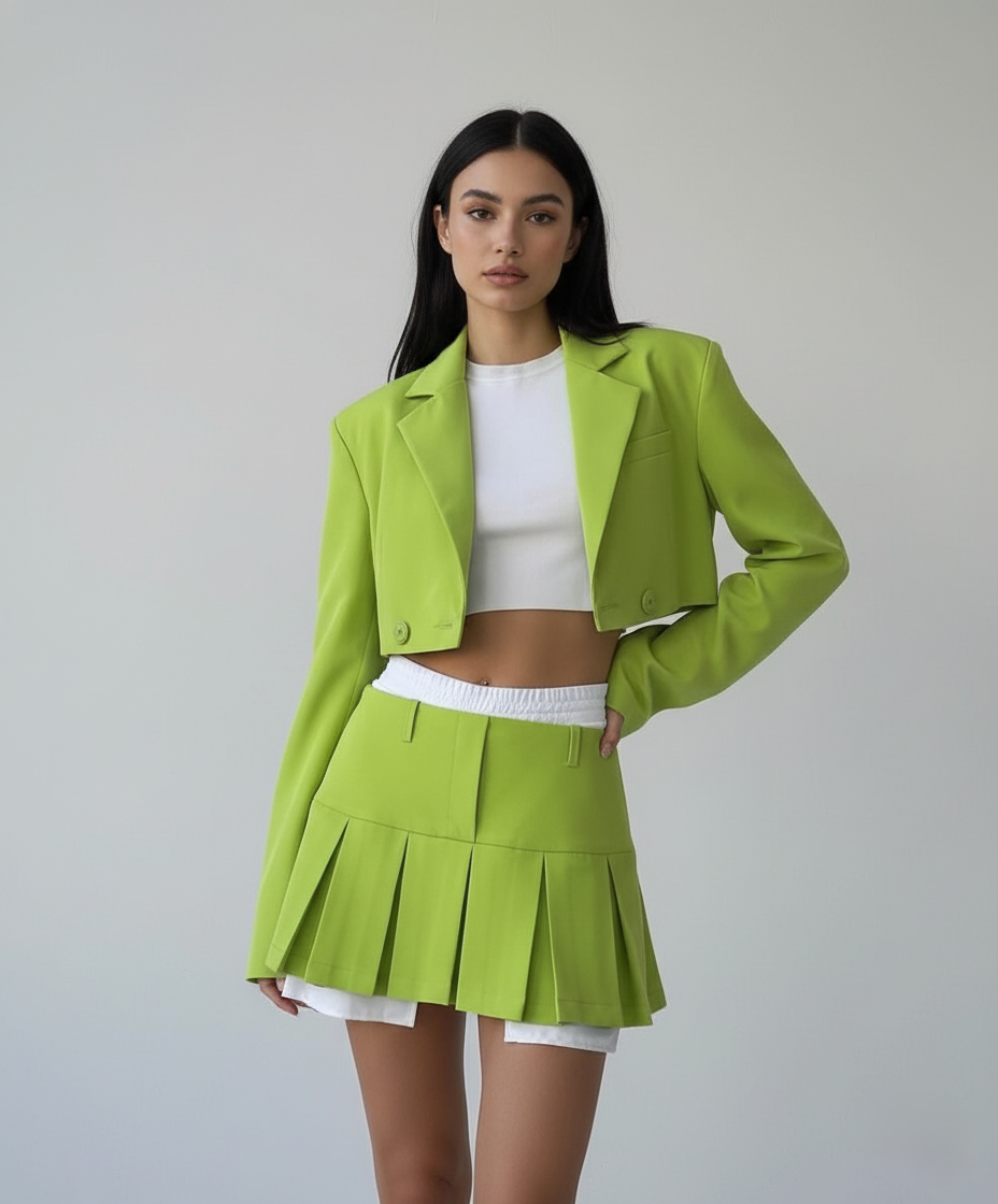 Meet the Siena set, a beautiful fashion ensemble that embodies elegance and style. This 3-piece outfit includes a pleated skirt, a chic coat, and matching leggings—perfectly coordinated for a polished yet effortless look. Designed with attention to detail, the Senne set offers sophistication and comfort for any occasion, from casual outings to special gatherings.