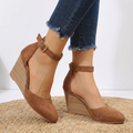 Crafted with a chic pointed toe and a secure ankle strap featuring a delicate buckle, the Siena wedge ensures a sleek silhouette and a confident stride. The sculpted wedge heel provides stable elevation, while the soft, velvety texture of the upper offers a luxurious feel. Pair them with a tailored midi skirt and a silk blouse for a sophisticated professional look, or with a flowing sundress for a captivating evening out.