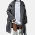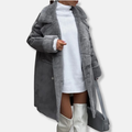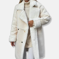 Crafted from soft suede blend, this women's knee-length shearling coat is designed with an oversized fit, ideal for winter wear. It features a sophisticated collared neckline, long sleeves, and a double-breasted button front, enhanced by wide lapels and faux shearling trim.