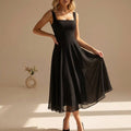 Fashioned from a beautifully draped, lightweight fabric, this dress features a chic square neckline and slender straps that highlight the décolletage. The fitted bodice gently gives way to a gracefully flowing midi skirt, creating an ethereal movement with every step. Its refined silhouette makes it incredibly versatile, perfect for pairing with strappy heels and minimalist jewelry for a sophisticated look, or with elegant flats for a charming daytime ensemble.