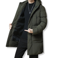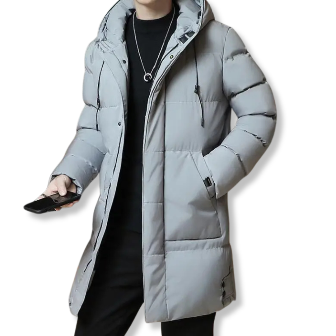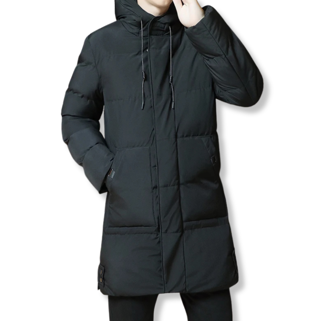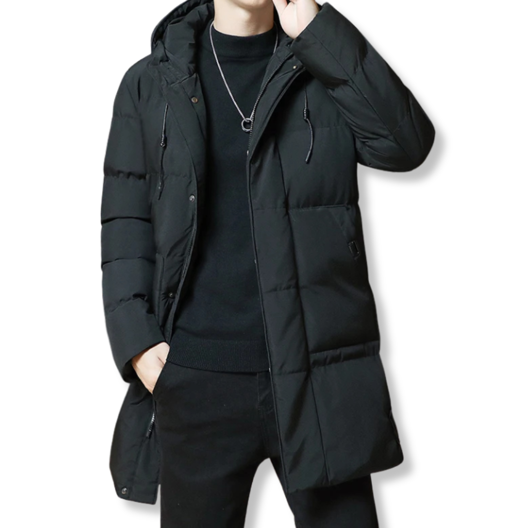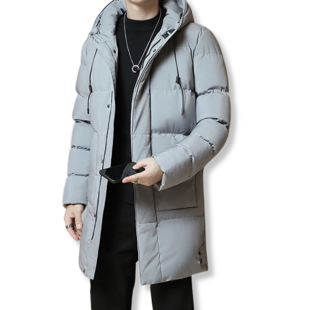 A regular fit hooded puffer jacket for men, crafted from durable nylon. This mid-thigh length jacket features a solid pattern and is enhanced with quilted detailing, a zipper front, and drawstring accents, perfect for casual wear.