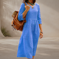 Crafted from a breathable, lightweight fabric, this midi dress features a flattering V-neckline and elegant three-quarter sleeves. The gathered waistline creates a graceful drape and a comfortable fit, while discreet side pockets add a touch of practical charm. Pair it with woven sandals and a statement necklace for a sophisticated resort look, or with simple flats for an effortlessly chic daytime ensemble.