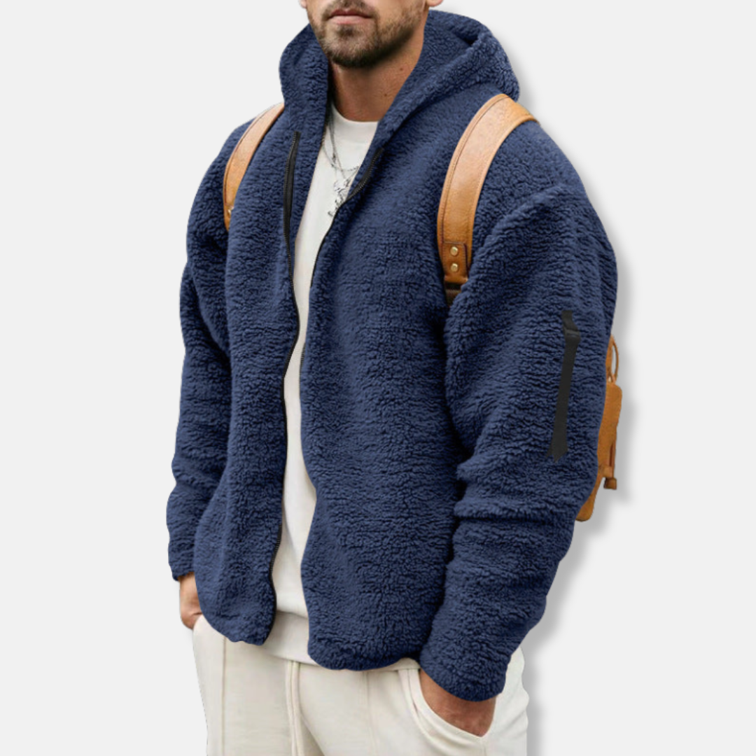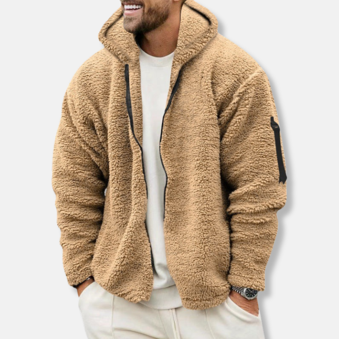 Crafted from soft fleece, this relaxed fit hooded jacket offers comfortable hip-length coverage. Designed for men, it features a practical zipper front and multiple pockets, including an arm pocket, making it ideal for casual wear.