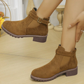 Suede Buckle Strap Ankle Boots by Couture-Emporium. Step out in style with these women's ankle boots featuring a soft-brushed fabric texture, chic buckle strap, and comfortable elastic panel. The gripped sole ensures stability, making them perfect for everyday wear.