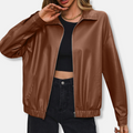 Introducing the PU Leather Relaxed Fit Biker Jacket from Couture-Emporium. This cropped, zip-front jacket features a relaxed fit, snap cuffs, and a classic spread collar. Crafted from smooth PU leather, it's the perfect blend of style and comfort for any casual occasion.