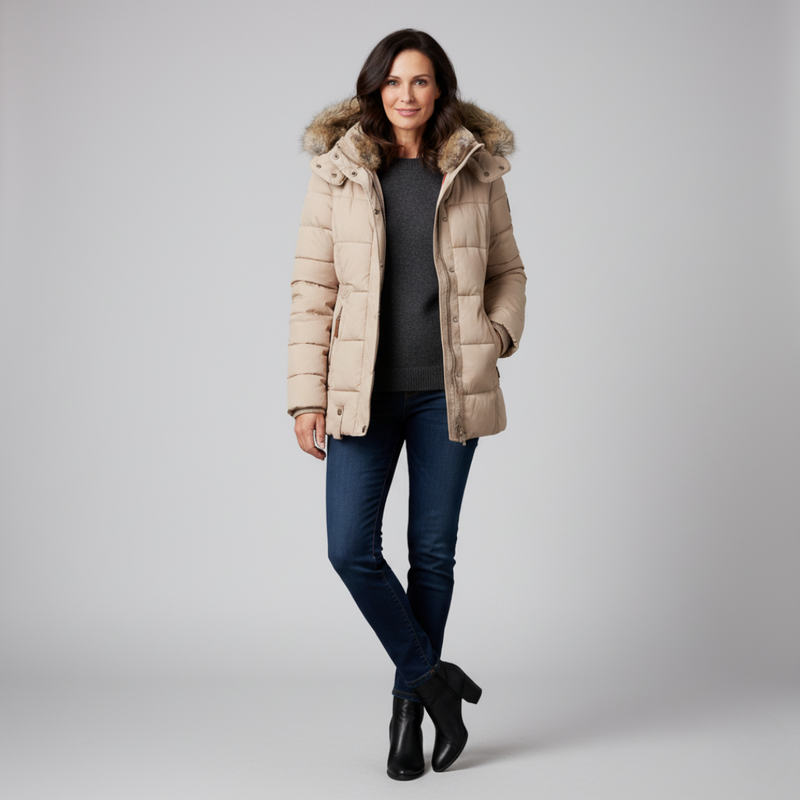 Conquer the cold in style with the Elisa Hayes Fur-Lined Down Puffer Jacket. Designed with a flattering fitted silhouette, this jacket combines cozy down insulation with a plush faux fur lining for unbeatable warmth. The detachable hood and elegant neutral tone make it versatile enough for both everyday wear and winter getaways. With its perfect balance of function and fashion, this jacket is your ultimate cold-weather essential.