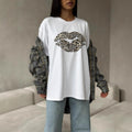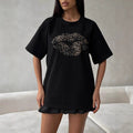 Women’s Graphic T-Shirt – Loose Fit – Cotton Blend – Leopard Lips Print – Short Sleeve. Express your wild side with this comfy and chic leopard lips graphic tee. This loose-fit, cotton-blend top is perfect for everyday wear and adds a touch of edgy fun to any outfit. Short sleeves and a breathable fabric ensure all-day comfort.
