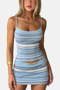 - Design: Slim-fit crop top with spaghetti straps and matching mini skirt