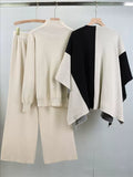 Three-Piece Relaxed Knit Open-Front Cape Suit Set - This cozy three-piece knit set by Couture-Emporium features a relaxed mock neck sweater, wide-leg pants, and a stylish open-front cape. Perfect for effortless style and comfort, this matching set will elevate your casual wardrobe.
