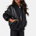 Step out in style with Couture-Emporium's Oversized Relaxed Fit Leather Jacket. This zip-front jacket boasts ribbed trim and a relaxed silhouette, perfect for adding an edgy yet comfortable touch to any outfit. Crafted for both fashion and function, this women's leather jacket is a must-have for effortless cool.