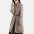 Cable Knit Belted Relaxed Fit Cardigan by Couture-Emporium. This long, relaxed fit cardigan features a cozy cable knit design and a flattering belted waist. Ribbed cuffs add a touch of detail to this wool-like fabric cardigan, perfect for layering and adding warmth to any outfit.