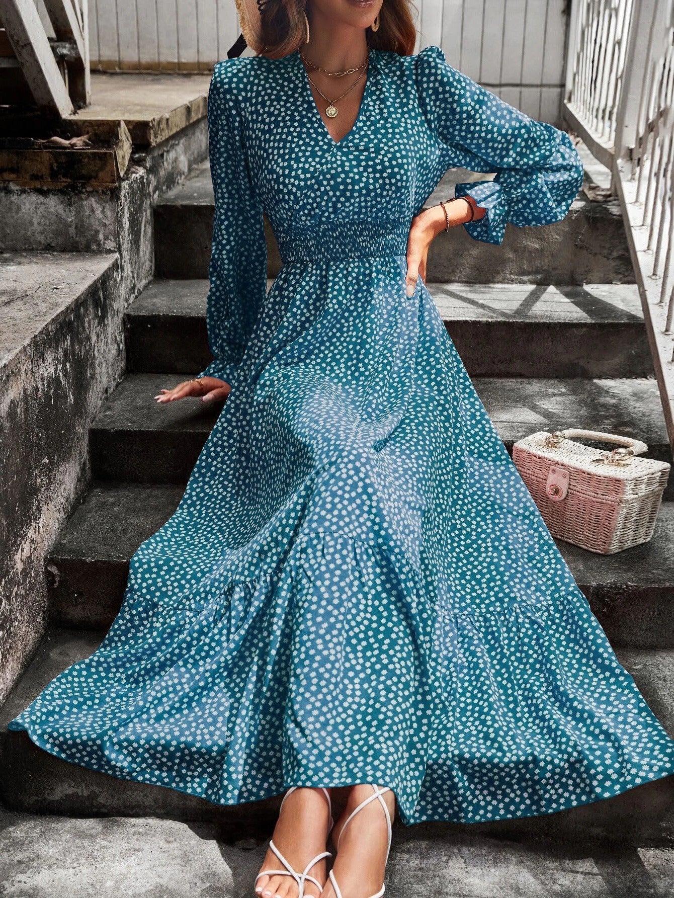 - Design: V-Neck, Polka Dot, Flared Tiered Skirt