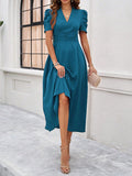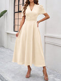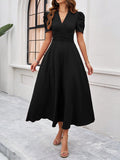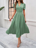 Women’s Midi Dress – V-Neck – Puff Sleeve – Fitted Waist – Pleated A-Line Skirt offers an elegant silhouette with a flattering V-neck and charming puff sleeves. The fitted waist flows into a pleated A-line skirt, perfect for any occasion. This dress combines comfort and style, making it a wardrobe essential.