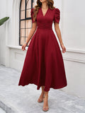 - Design: V-neck, puff sleeve, fitted waist, pleated A-line
