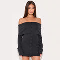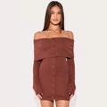 Flaunt your figure in this Women’s Off-Shoulder Dress – Slim Fit – Ribbed Knit – Button Front Mini – Long Sleeve from Couture-Emporium. This chic mini dress features a flattering slim fit, a trendy off-shoulder neckline, and a button-front design in a comfortable ribbed knit. Perfect for adding a touch of effortless elegance to your wardrobe.