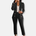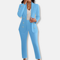 Slim Fit Shawl Collar two-piece Pants Set from Couture-Emporium offers a sleek, tailored look. This women's pants set features a double-breasted blazer with an elegant shawl collar and matching straight-leg trousers for a sophisticated silhouette, perfect for office or semi-formal events.
