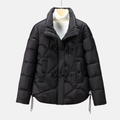 Quilted Geometric Pattern Puffer Jacket from Couture-Emporium. Stay stylish and warm in this women's puffer jacket featuring a unique geometric pattern, distinctive frog button closures, and an adjustable hem for a custom fit. Perfect for adding a touch of flair to your everyday look while staying cozy.