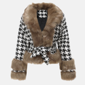 Display a timeless elegance with Couture-Emporium's Houndstooth Pattern Tailored Belted Short Coat. Featuring a classic houndstooth design, plush fur trim, and a flattering belted waist, this short coat offers warmth and sophistication in a tailored silhouette. Perfect for adding a touch of class to any outfit.