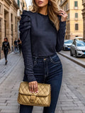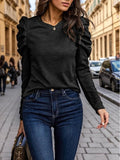 Soft Knit Puff Sleeve Crew Neck Sweater from Couture-Emporium. This regular fit sweater features a classic crew neck and stylish structured puff sleeves. Crafted from a soft knit material blend, it's perfect for adding a touch of elegance to your casual wardrobe.