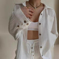 Stay effortlessly stylish with Couture-Emporium's Women’s Two-Piece Set – Oversized Button-Up Shirt paired with High Waist Drawstring Shorts. This comfortable fiber blend set features a relaxed fit, perfect for casual days. The oversized button-up and high-waisted shorts create a chic, coordinated look. Ideal for lounging or a relaxed outing.