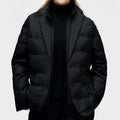 Quilted Insulated down Hip Length Jacket from Couture-Emporium. Stay cozy and stylish with this women’s quilted windbreaker featuring a hip-length cut, insulated design, button-front closure and practical flap pockets. Ideal for transitional weather.